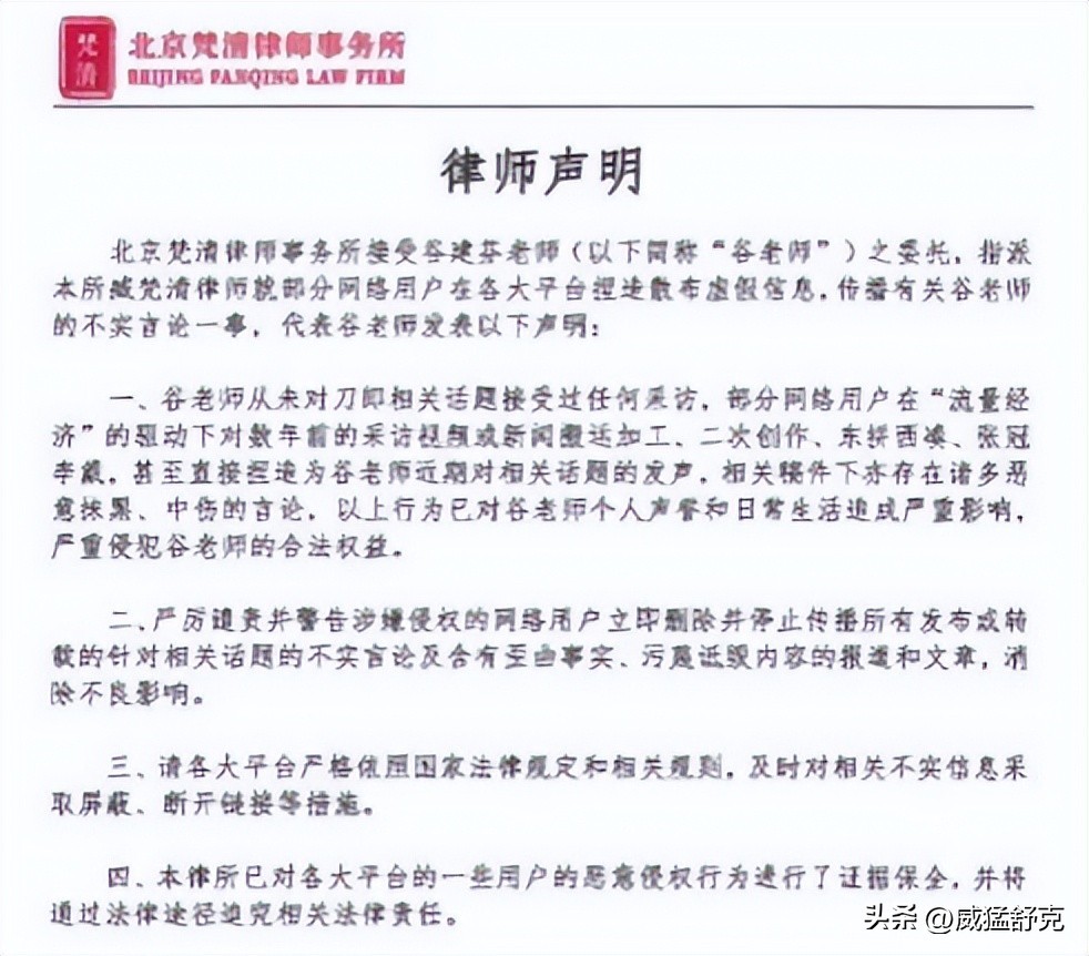而谷女士请律师写的这份声明,也充分表明了谷女士对于刀郎、那英这件事情的态度是事不关己,高高挂起的。“网络不是法外之地。”