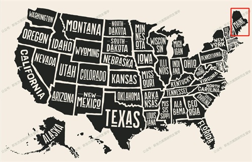 图中红色区域为缅因州位置,图源维基百科