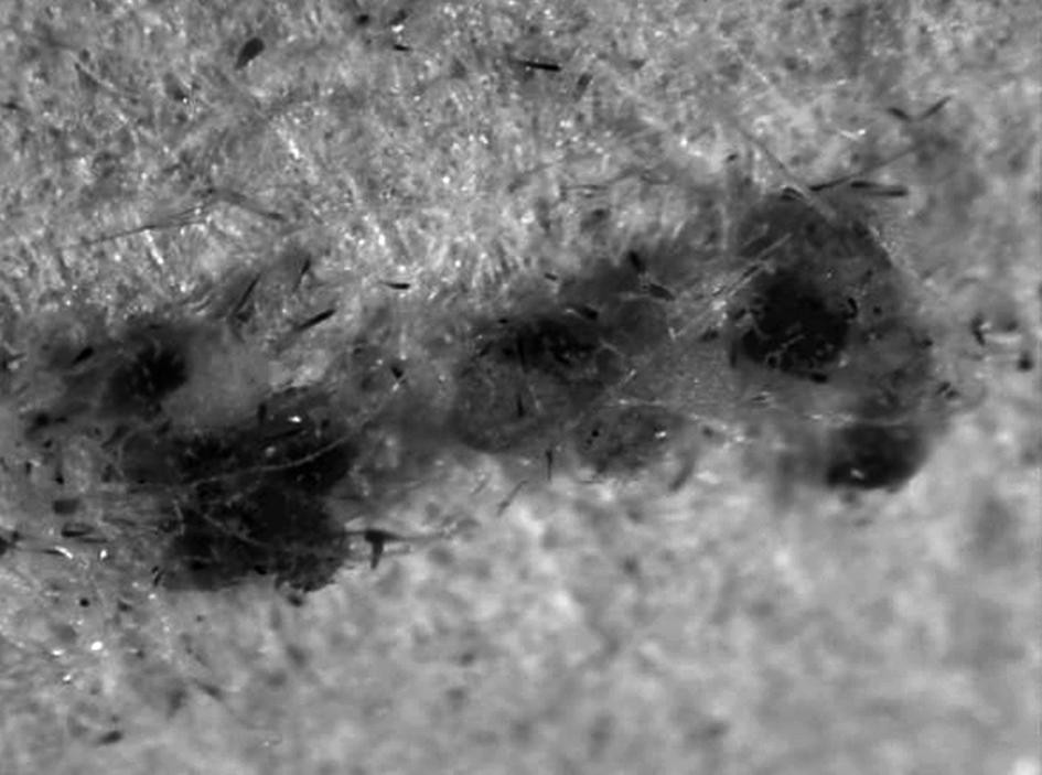 蛹。 初期黄白色,渐变灰黑色。 足和触角端部游离,蛹壁光滑无刺(图6)。