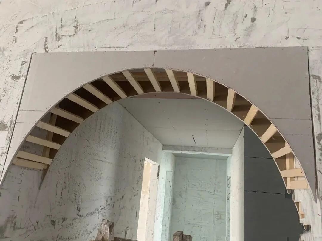 拱形区域需用木方加固。确定好拱形门的弧度和尺寸后,在细木工板上描绘再切割出弧形,拱形区域需用木方加固,木方间隔5cm即可,然后门洞表面需封上石膏板。