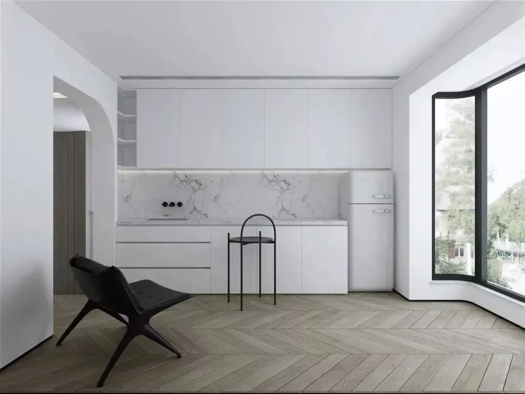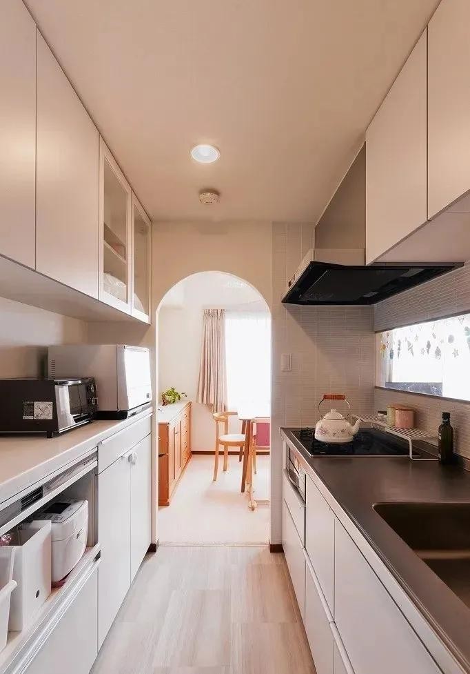 厨房。拱形元素运用在厨房也很有特色,带有弧度的门洞不显空间单调,而且空间感更通透,让做饭也变得仪式感满满。