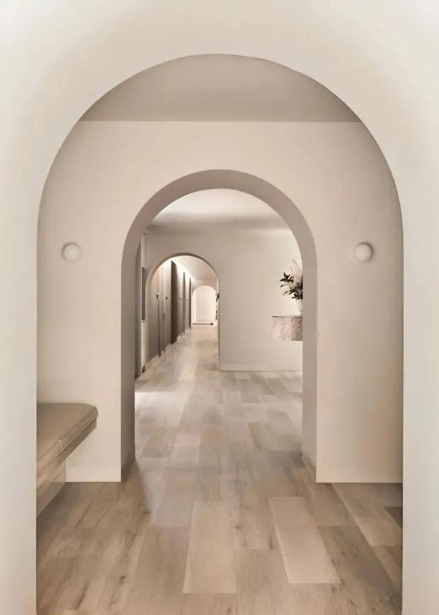拉伸层高。顶部的拱能将压力分向两侧,拱形门的承重能力很好,修长的拱形门有一种向上拉伸感,可以在视觉上让空间显高!