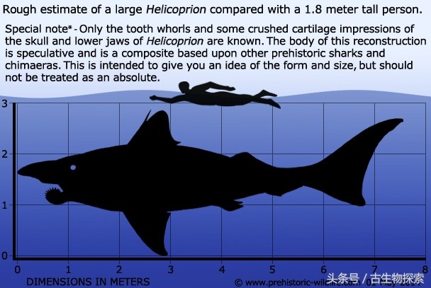 图注:一条7米长的旋齿鲨与人类的体型对比,图片来自网络
