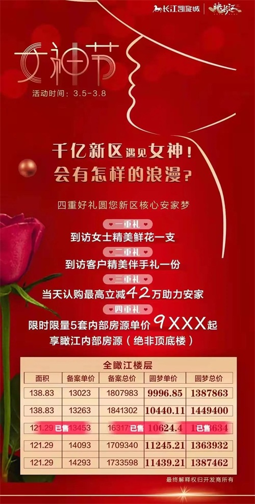 长江凯旋城推出5套特价房源,非顶底楼,建面约121.29-138.83平,折后单价低至9996.85元/平,折后总价低至1288634元,当天认购总价最高立减42万元!(活动时间:3.5-3.8)