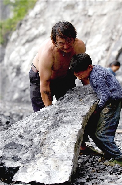 记者在采访驻村第一书记时,无意间看到了一张照片——高山绝壁上,男女老少肩挑背扛,只为抠出一条路。山崖上,男人一锤一锤打下岩石,女人徒手将岩石推下山崖。一位赤着上身的壮汉和一位年龄七八岁男孩一起推一块岩石。穿着胶鞋的男孩右脚踮起,双手抱住岩石往外推,使出了吃奶的力气(左图)。