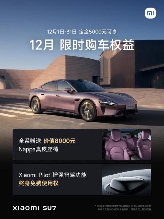 12月1日,小米汽车官宣了12月限时购车权益,12月1日至31日,下定全系可享受:1.赠送价值8000元Nappa真皮座椅;2.小米智能驾驶增强智驾功能终身免费。