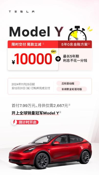 11 月 25 日,特斯拉中国官微宣布Model Y 限时交付尾款立减 10000 元,可叠加五年 0 息政策,用户需要在 2024 年 11 月 25 日起至 12 月 31 日(含)订购并完成交付,该活动适用于后轮驱动版、长续航全轮驱动版车型。