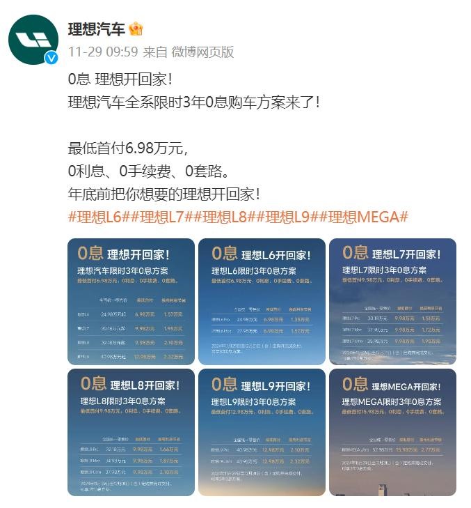 11月29日,理想汽车推出全系限时3年0息购车方案,并表示“最低首付6.98万元,0利息、0手续费、0套路”。据了解,从理想L6至L9全系车型以及理想MEGA均可享受相关政策。