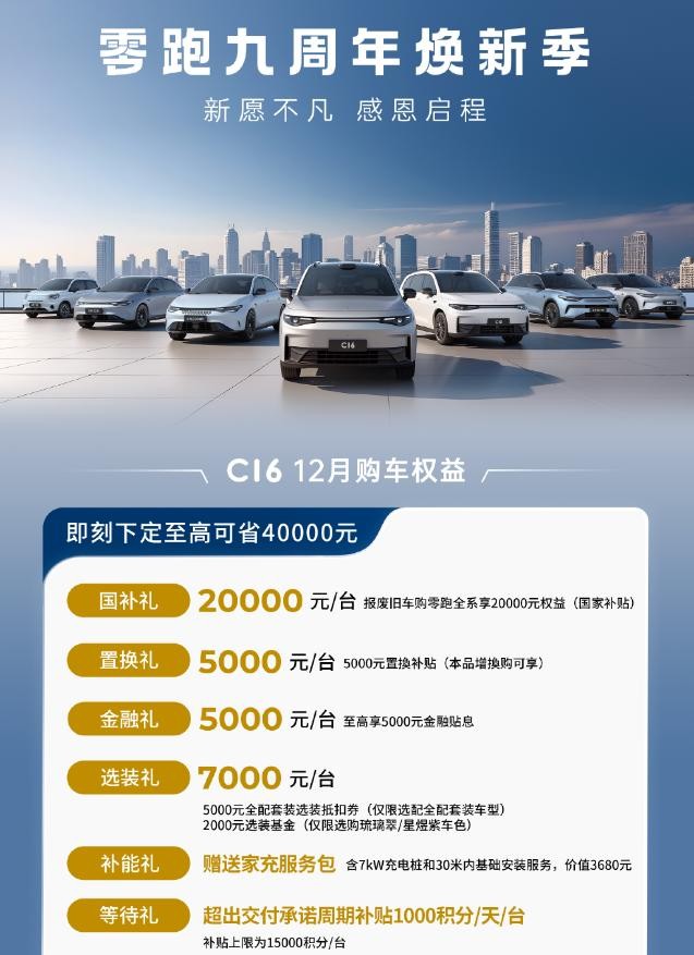 12月2日,零跑汽车公布了主题为“零跑九周年焕新季”的12月购车权益。从即日起至12月31日,通过零跑官方渠道缴纳5000元定金的用户,将享受包括国家补贴、置换补贴、选装基金、金融优惠、补能服务在内的多重购车权益。此次优惠活动覆盖零跑C16 、C10、C11、C01、T03等全系车型。
