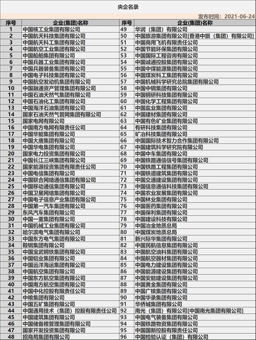 截至2021年6月24日,国务院国资委履行出资人职责的中央企业共96家。具体如下: