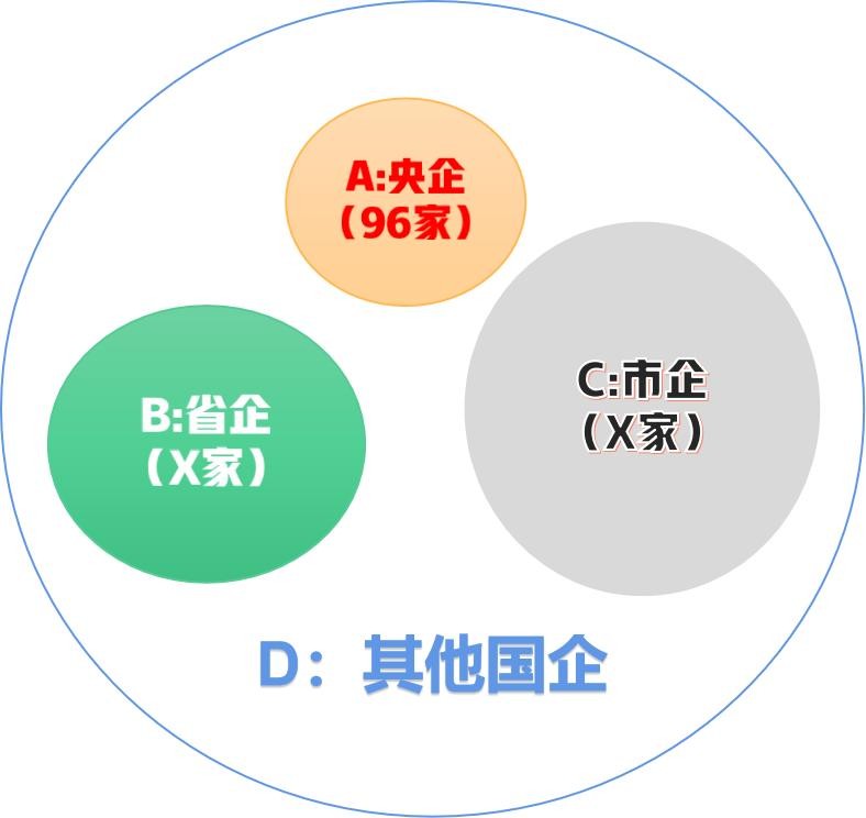 为了方便,我们用字母表示。假设:国有企业=G,央企=A,省企=B,市企=C,其他国企=D。则有G=A+B+C+D;A≠B≠C≠D。由此可知:国企包含央企,央企属于国企的一部分。