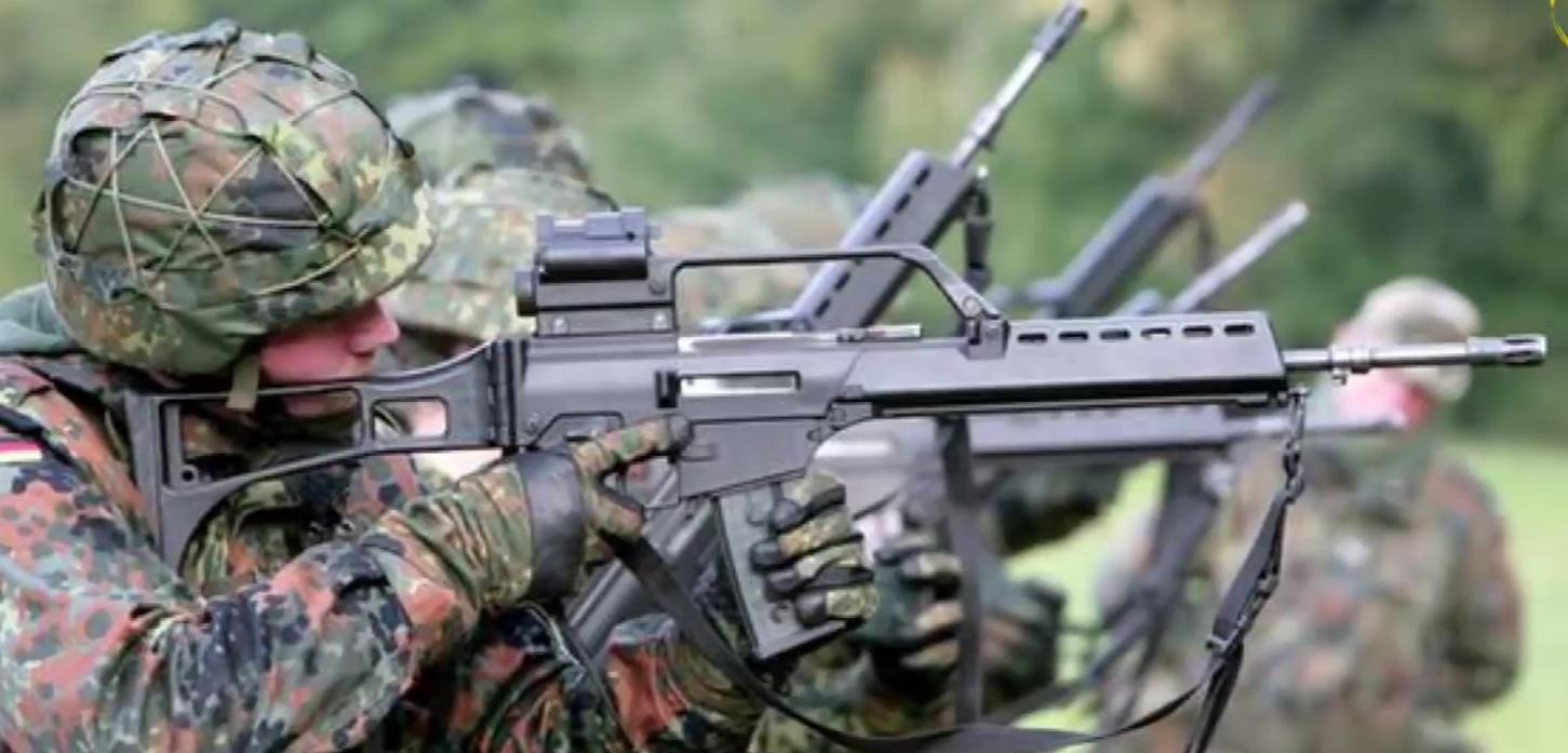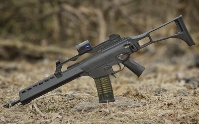G36突击步枪由Heckler和Koch,在90年代早期在德国设计,这种突击步枪是用当时最先进的技术制造出来由38发半透明塑料盒状弹夹供应弹药,也可以由两三个弹夹夹在一起快速装弹。
