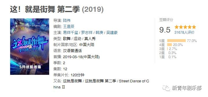 节目播出3期后,3万多名豆瓣用户参与打分,分数仍然稳定在9.5分。而去年《这!就是街舞》第一季播出后,超过5万名用户打出8.6的高分,《这!就是街舞2》打破了综N代口碑、关注度不及前作的魔咒,完成了对第一季的超越。