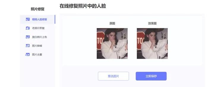 工具还有各种图片压缩、智能证件照、照片变漫画、老照片修复等功能。如果想修复模糊的人脸照片,上传模糊的人脸照片等待一会就能获得修复后超清晰的照片。