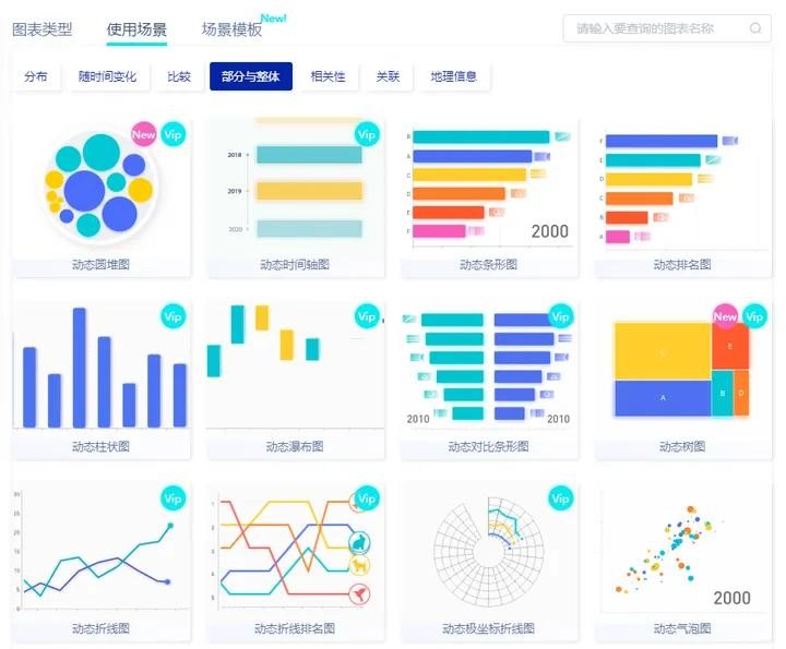 按使用场景详细分类:包括,分布、随时间变化、、部分与整体、相关性等等。