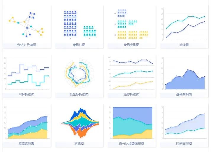 图表类型超丰富:折线图、导向图、面积图、河流图等等,个个都很精美。