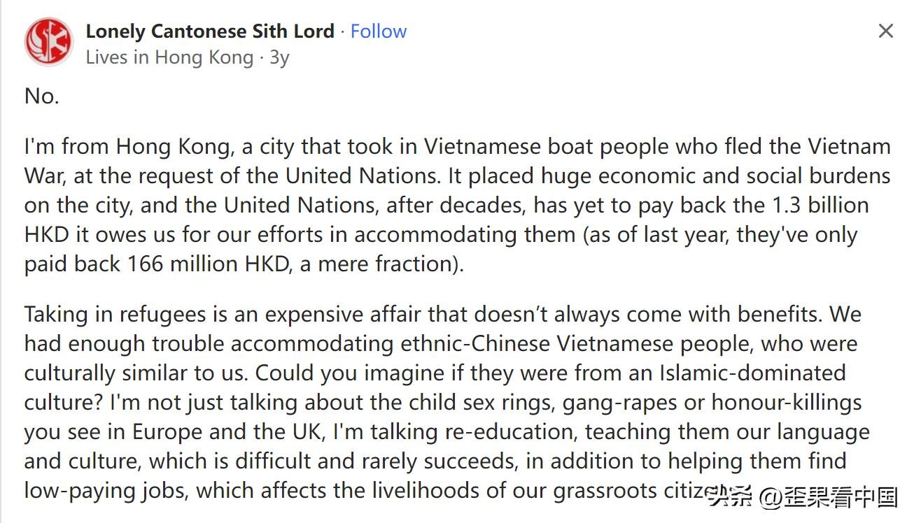 我来自香港,在联合国的要求下,这座城市接纳了逃离越南战争的越南船民。这给香港带来了巨大的经济和社会负担,而联合国在数十年后仍未偿还我们为安置他们而欠下的13亿港元(截至去年,他们只偿还了1.66亿港元,仅一个零头)。