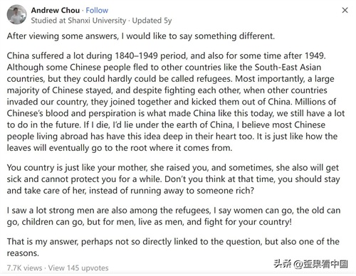 1840-1949年期间,以及1949年之后的一段时间,中国遭受了很多苦难。虽然有些中国人逃到其他国家,如东南亚国家,但他们几乎不能被称之为难民。最重要的是,绝大多数中国人留下来了,尽管彼此之间存在一些斗争,但当其他国家入侵我们的国家时,我们就会联合起来,把他们赶出了中国。千百万中国人的血汗铸就了今天的中国,未来我们还有很多工作要做。如果我死了,我会躺在中国的土地下,我相信大多数生活在国外的中国人心里也有这个想法。这就像叶子最终会回到它的根一样。