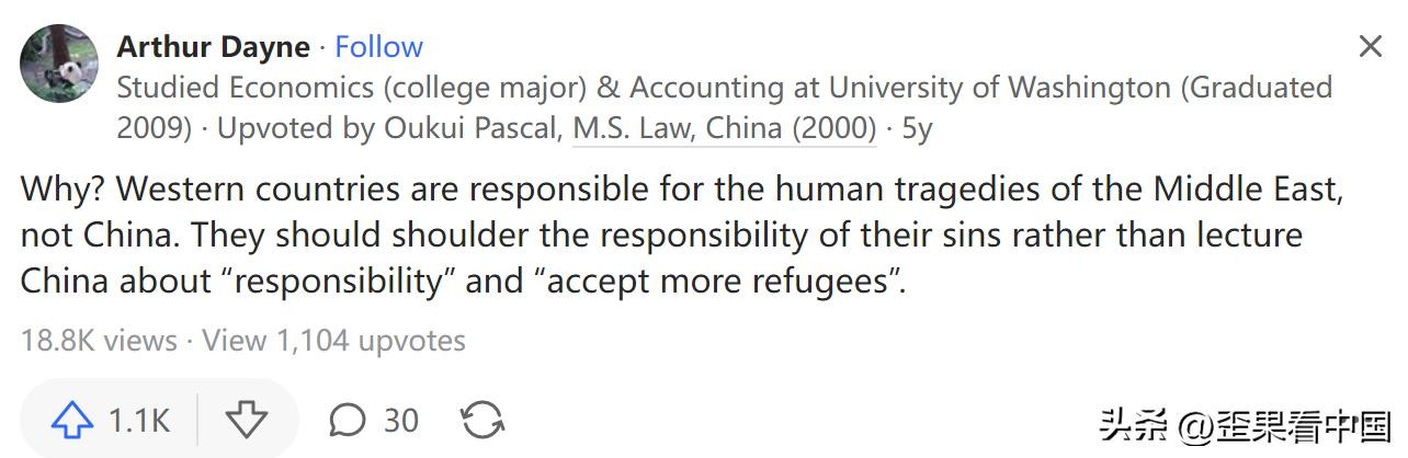 凭什么?西方国家应对中东的人间悲剧负责,而不是中国。他们应该为自己的罪行承担责任,而不是对中国说教“责任”和“接受更多难民”。