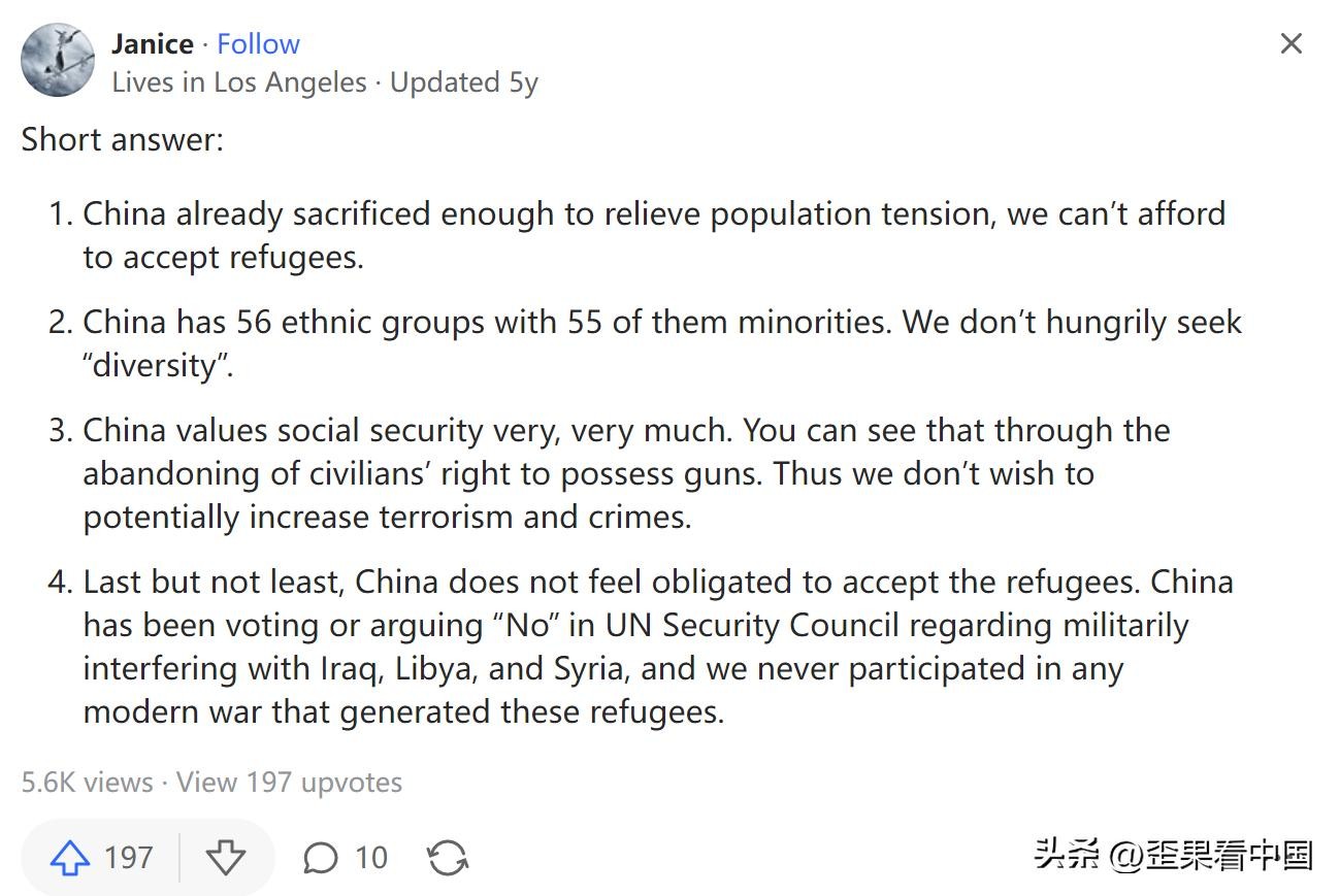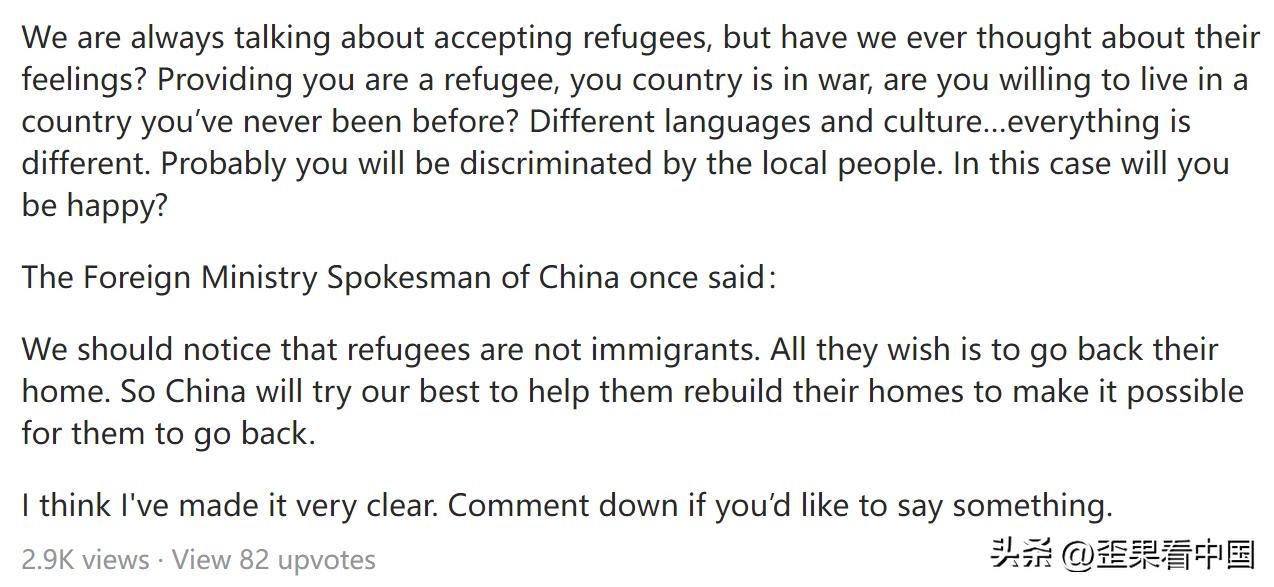在美版问答网上就有外国网友提问:中国应该接收难民吗?该问题也是吸引了众多网友得回答。我们来看看最受大家欢迎的几个回复。