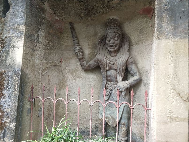 颐神洞前的雕塑凶神恶煞,对联倒是和谐“玉台钟秀气,宝殿扫妖芒”
