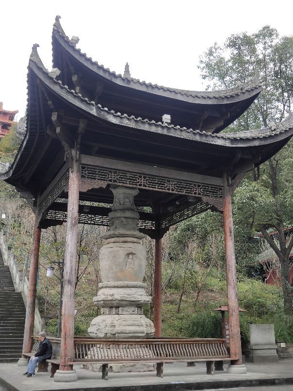 这是唐代佛塔,造型随层次不同有不同形制,最低层是四方,依次有六方,圆柱,中间嵌有佛像,顶部有火焰纹顶,亭子是后面修复时加上的,2008年因地震倒塌,塔身许多层面都是后期修复的。