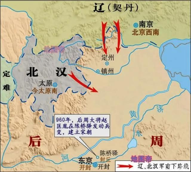 公元954年,刘崇之子刘承钧继位为北汉皇帝,刘承钧可以作为守成之主。此时的北汉国力衰弱,辽国和北汉也不敢大规模对后周用兵。此时的北汉策略主要转为联合南唐,共同抵御后周。