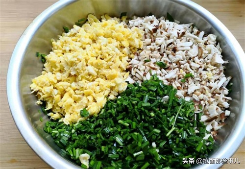 韭菜馅饺子,无论搭配什么食材,都要记住分开调馅,像是韭菜鸡蛋馅的,就将鸡蛋单独调味,韭菜在单独调味,然后在包饺子的时候,取适量鸡蛋放入韭菜馅中,搅拌均匀后,在包饺子。