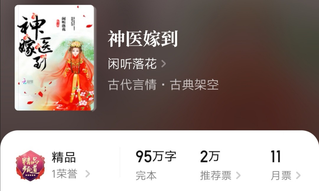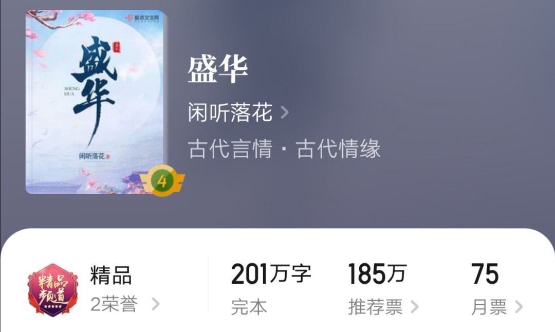 闲听落花,阅文大神作家,自2010年开始写作,到现在共创作11作品,字数达到近930多万,作品粉丝近200万。闲大的作品古言居多,文笔细腻绵长,她的作品里常常有着温暖动人的亲情与爱情,值得细细品味。