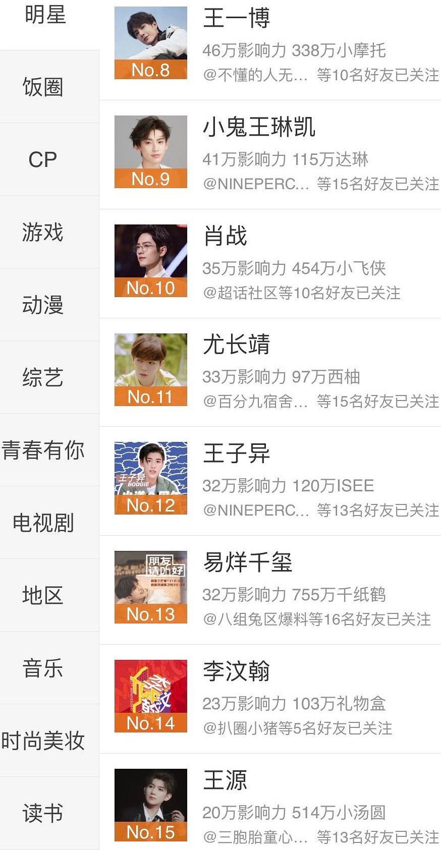 Nine Percent的团粉和九个成员的个人粉太厉害了,把顶级流量王一博挤到了第八的位置,肖战更是掉到了第十,易烊千玺第十三,李汶翰第十四,王源第十五。李汶翰是《青春有你》的冠军,是蔡徐坤的直系师弟。