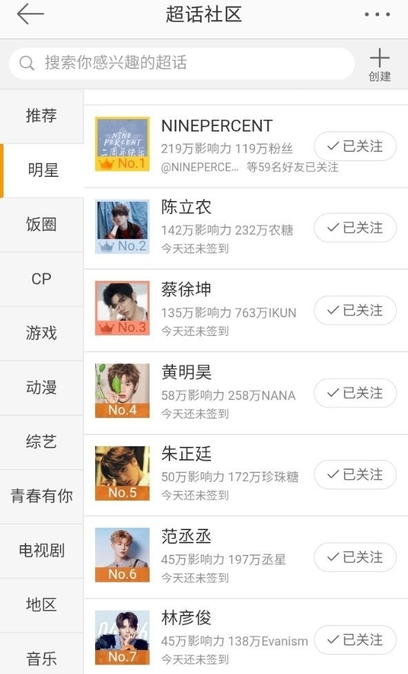 虽然Nine Percent解散了,但是团粉依然还在,组合成立两周年之际,Nine Percent的微博超话登顶榜首了,9个成员的个人排名也很高:陈立农第二、蔡徐坤第三、黄明昊第四、朱正廷第五、范丞丞第六、林彦俊第七、王琳凯第八、尤长靖第十一、王子异第十二。