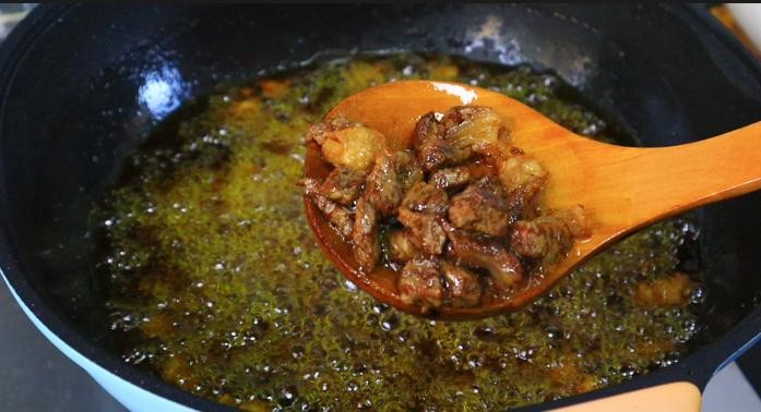 第四步、接着倒入牛肉,把牛肉的水分炸出来,中火差不多15分钟,差不多像这样表面焦黄就可以了。