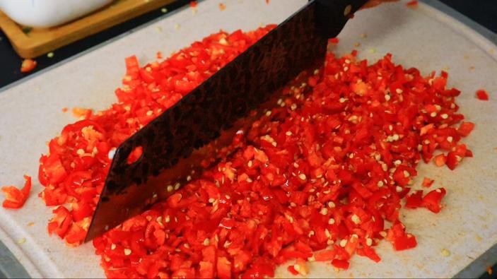第二步、准备1个杏鲍菇洗净切成小丁,红辣椒先切成圈,然后放到案板上剁碎,剁好装碗备用。
