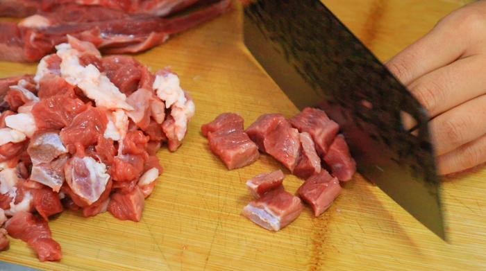第二步、接着先把牛肉切成片,再切成长条,最后切成小丁,大小根据自己喜好,喜欢大口吃肉,可以切稍微大点,切好后装盘备用。