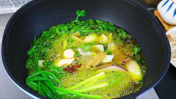 第三步、锅里多倒点油,放香菜葱段洋葱姜片,再来点八角桂皮白芷,炸一个料油,这个料油除了做酱,平时拌肉馅包饺子也很好吃,,多做点也不会坏,中小火慢炸,一直炸到蔬菜变得焦黄即可捞出。