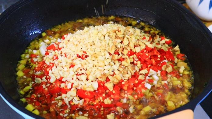 第五步、然后倒入姜蒜末、杏鲍菇、辣椒,花生核桃碎,大火翻炒均匀,调味只需放2包紫苏酱即可,香味很浓郁,如果没有的话,可以放一大勺黄豆酱、半勺甜面酱、半勺海鲜酱、适量蚝油、白糖即可。