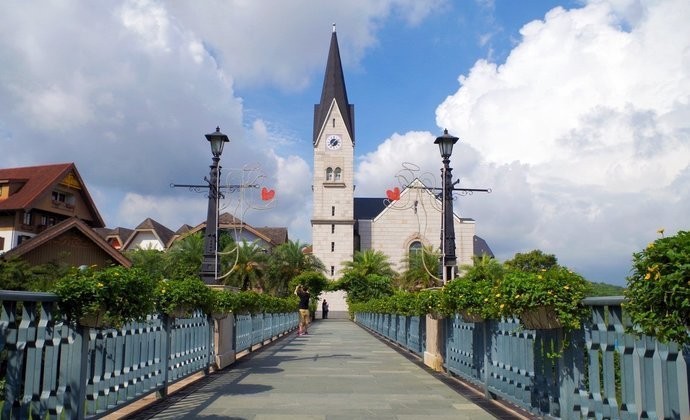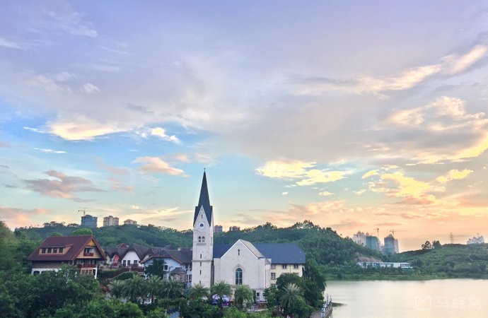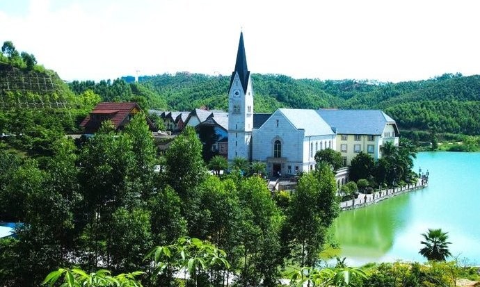 惠州哈施塔特小镇是由国企五矿集团投资60亿兴建的,是个三面环山一面环湖的地方,原生内湖面积达17万平方米,湖泊边上就是非常经典又精致的欧式教堂,还有五颜六色的房子,会给人一种身置欧洲的感觉。