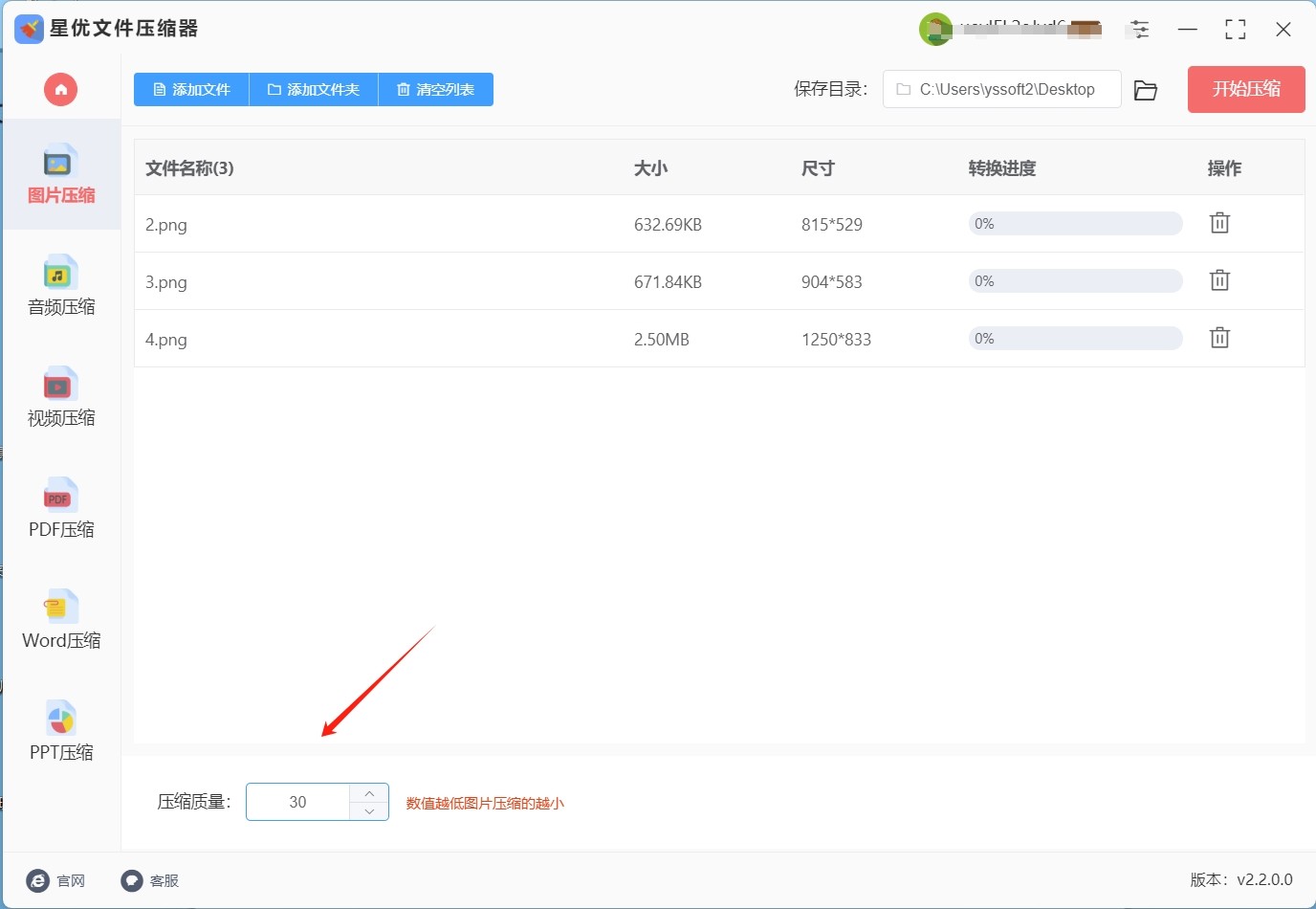 步骤3:在软件界面的底部,您可以调整压缩质量。请注意,设置的质量数值值越小,图片文件的大小将被压缩得越小。