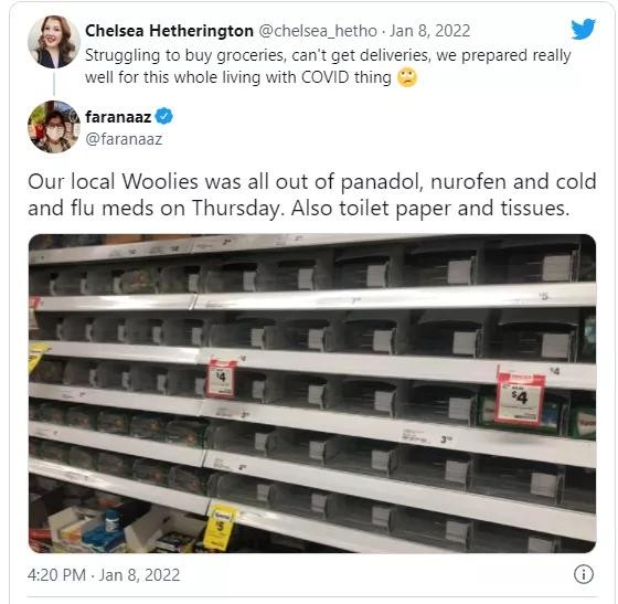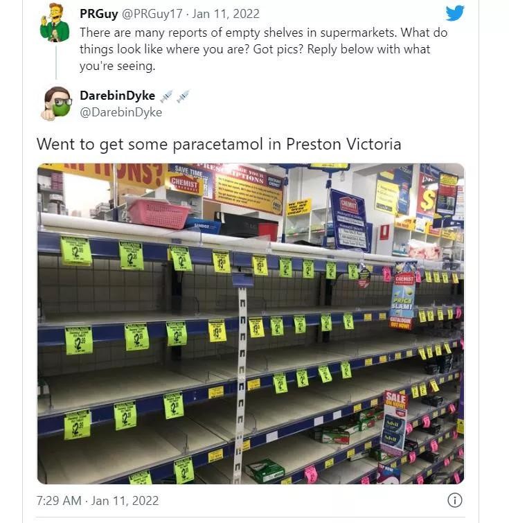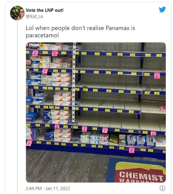 Twitter用户Katerina分享的一张照片显示,Chemist Warehouse货架上的Panadol和Nurofen被抢空。