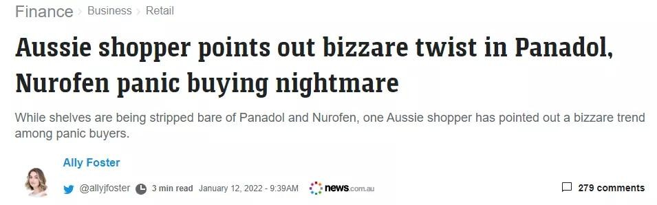 根据News.coma.au的报道,由于库存供应短缺和恐慌性购买,全澳超市和药房的Panadol和Nurofen被抢购一空。