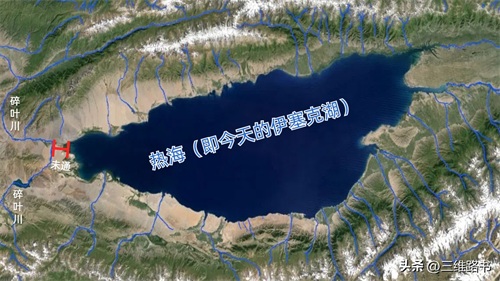 从龟兹到碎叶城,是要经过过阗池的,阗池即今天的伊塞克湖,唐朝时称她为“热海”,在《新唐书·地理志》是这样描述的:“傍碎卜水五十里至热海。又四十里至冻城,又百一十里至贺猎城,又三十里至叶支城。”,所以从龟兹到碎叶城这条路,当时的人们又称其为热海道。