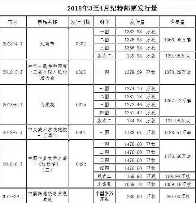 相对往年,2018年中国邮政公布当年纪特邮票发行量的速度略微提速了一点,不久前公布的2018年3至4月纪特邮票发行量之后,我们对今年的邮票发行工作其实也可以管中窥豹地略知一二了。
