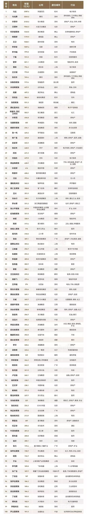 2018福布斯中国400富豪榜TOP100