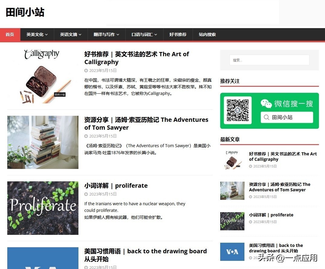 一个综合类的英语学习网站,内置英美文化、英语文摘、翻译与写作、口语与词汇和好书推荐五大模块,提供的多种形式学习教程和学习资也有一直更新,内容质量和价值都很高,可帮助全方位提高英语口语、词汇、写作和阅读。