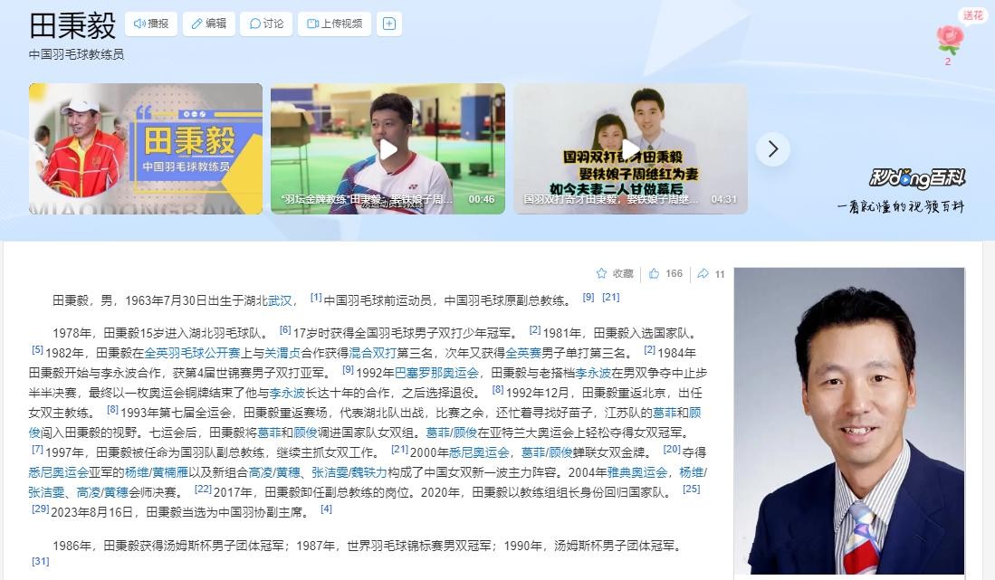 如今的田秉毅已是中国羽协副主席,同时担任羽毛球队的双打主教练。
