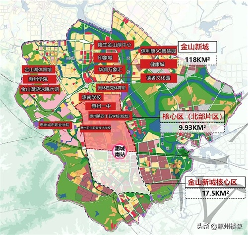 2019年,惠州以金山湖湖心岛为片区中心,版图向东、向南延伸,一个118平方公里的金山新城横空出世,并以“新中心、新生态、新引擎”为定位,打造成惠州未来城市中心。(来源《惠州市金山新天地分区规划(2019-2035)》)