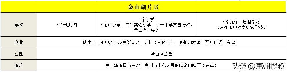 目前该片区开发程度较为成熟,商业设施也较为充足,包括隆生金山湖中心、港惠新天地、天虹(三环店)、惠州印象城、万汇广场(在建)、还有金山湖公园大型休闲场所,房价相对其他片区较高,适合改善人群的购房者。