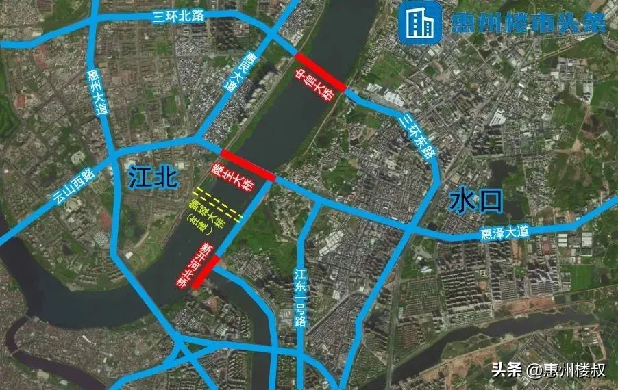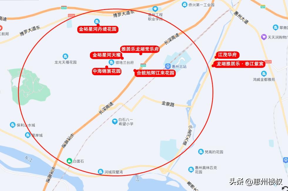江北西区以从惠州大道出发至长深高速一带,北至金泉路、南至东江(惠博大道)。