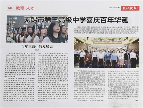 10月10日《现代快报》报道:无锡市第三高级中学喜庆百年华诞