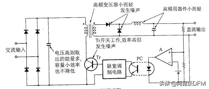 这就是现在AC-DC开关电源的原理框图,其中Tr部分就是一个开关,控制开关的就是后面的脉宽调制电路 (PWM)